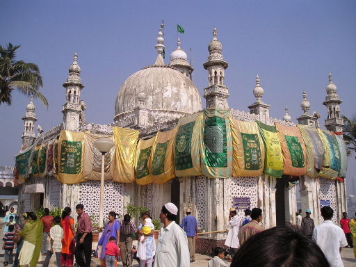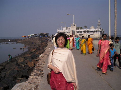 | ハジ・アリ廟(ダルガー)へつづく道 | 聖人ハジ・アリの墓 入り口は男女別で、中へは靴を脱いで入ります。イスラムの人たちは入る前に足を洗っているようです。 |
