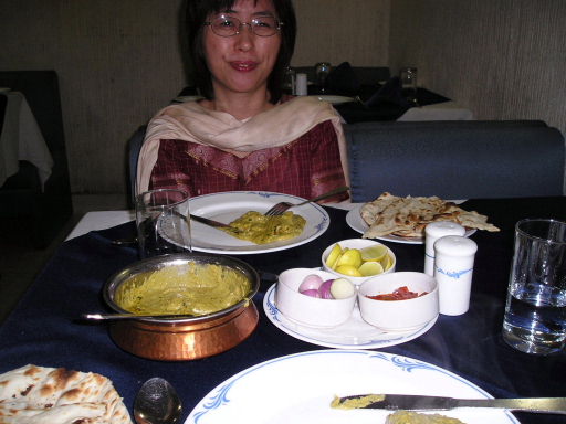 | 昼食のカレー | ムンバイチェンバーオーケストラの代表・ジニーさん | 純粋ベジタリアンの食事 コップの中のラッシーというミルクは塩コショウ味で、スープのようです。 |