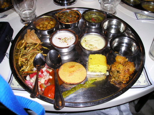 純粋ベジタリアンの食事 豆や野菜のカレー、ヨーグルト、チーズ、などが中心です。 油断するとお代わりを注がれてしまいます。 |