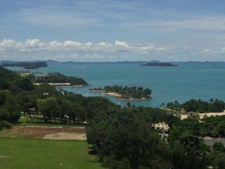 セントーサ島のマーライオンのてっぺんからのながめです。遠くに霞んでいるのはインドネシアの島々です。